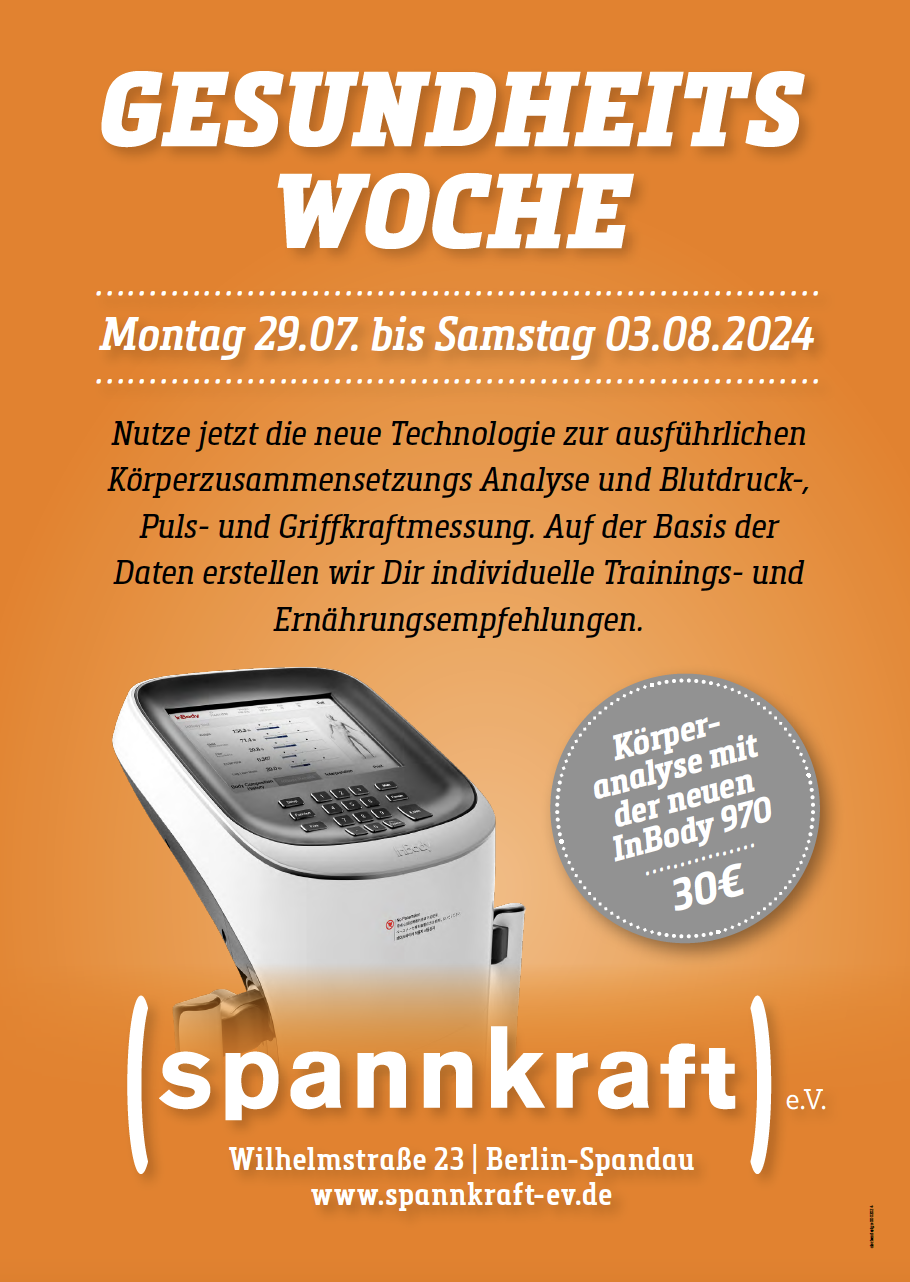 Liebe Spannkraftler und Interessenten, vom 28.06. - 10.07.2021 finden endlich wieder unsere InBody Check-Up Tage statt. Innerhalb von 60 Sekunden ermitteln ...